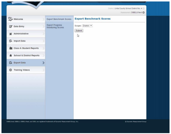 How to download DIBELS University of Oregon Data file 1. Login to the UO DIBELS Data System website and click on the Reports tab. 2. Select District Scope and Under Data Farming click on Export. 3. Select the entire District, All Schools, All Grades, ...
